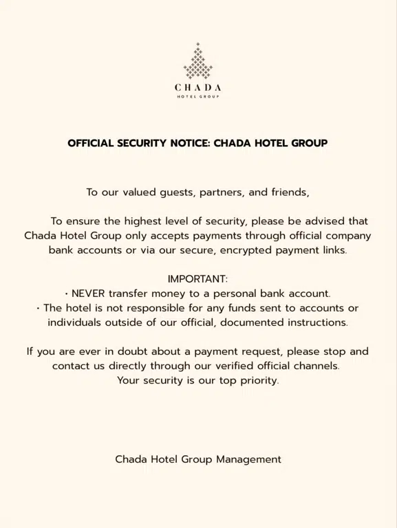 Chada Hotel Group only accepts payments through official company